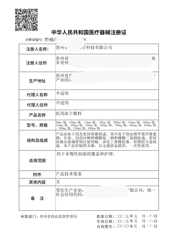 | 结构及组成/主要组成成分: | 产品由冻干剂及密封容器组成。其中冻干剂由羧甲基纤维素钠、甘油、泊洛沙姆和磷酸氢二钠和磷酸二氢钠组成;密封容器由玻璃管制注射剂瓶、卤化丁基橡胶塞、铝塑组合盖组成。本产品经辐照灭菌,以无菌状态提供,一次性使用。 |