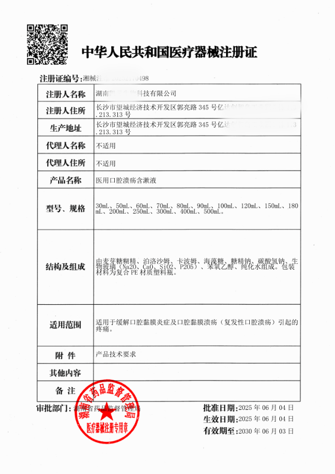 | 适用范围/预期用途: | 适用于缓解口腔黏膜炎症及口腔黏膜溃疡(复发性口腔溃疡)引起的疼痛。 |
