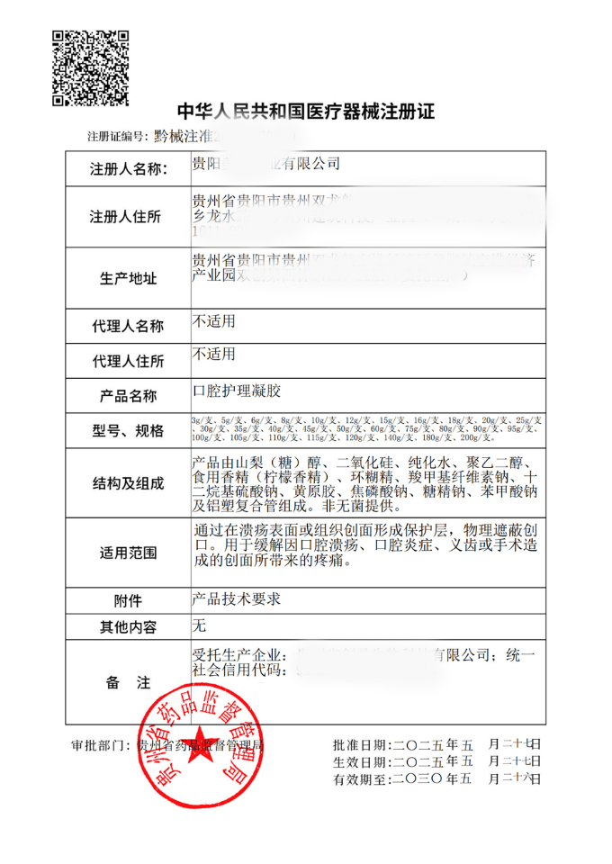 | 适用范围/预期用途: | 通过在溃疡表面或组织创面形成保护层,物理遮蔽创口。用于缓解因口腔溃疡、口腔炎症、义齿或手术造成的创面所带来的疼痛。 |