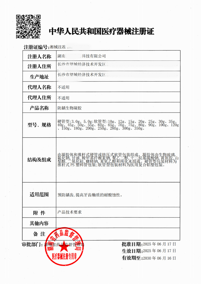 | 结构及组成/主要组成成分: | 由凝胶体和推杆式硬管或挤压式软管包装组成。凝胶体由生物玻璃,氟化钠,甘油,羧甲基纤维素钠,聚乙二醇,十二烷基硫酸钠,黄原胶,山梨醇,二氧化硅,糖精钠,苯氧乙醇和纯化水组成。硬管型包装材料为推杆式 PS 塑料管包装;软管型包装材料为医用复合铝塑包装。 |