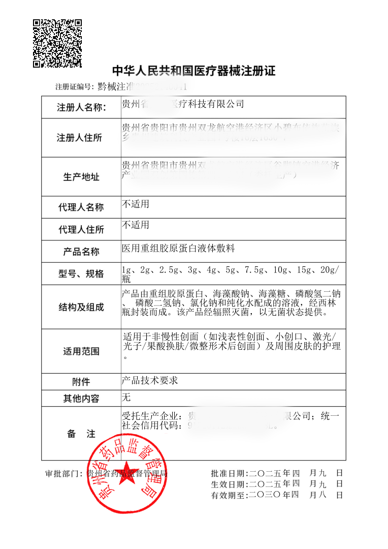 | 产品名称: | 医用重组胶原蛋白液体敷料 |