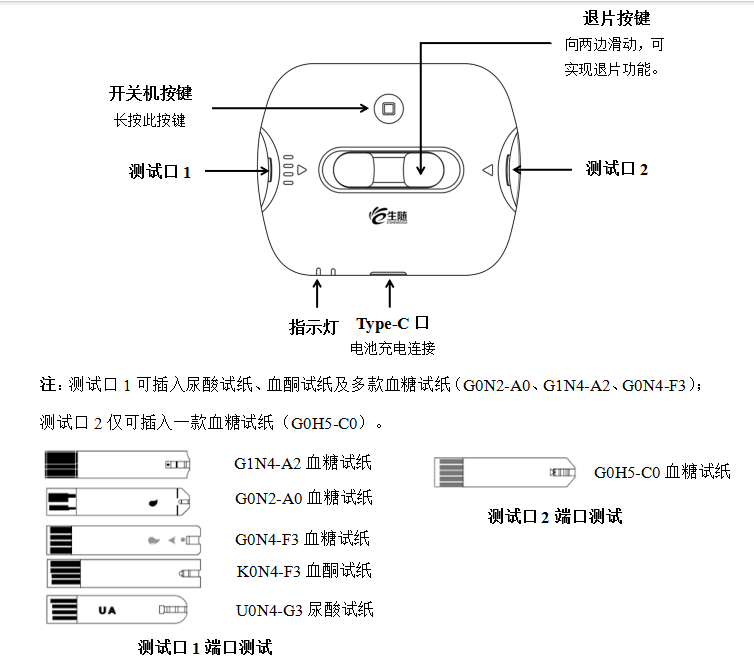| 结构及组成/主要组成成分: | 该产品由主机和附件组成。主机由检测模块、数据处理模块、蓝牙通讯模块、电源模块(内置锂电池,充电线(选配))、试纸条插口、TypeC端口、按键、外壳及软件(含嵌入式软件(软件发布版本2)和手机APP(软件发布版本1,Android系统))组成。 |
