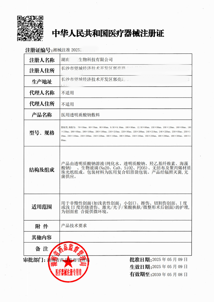 | 产品名称: | 医用透明质酸钠敷料 |